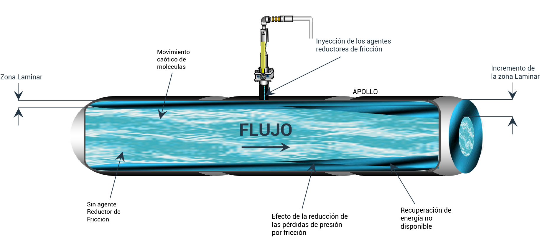 Los Agentes Reductores de Fricción Apollo, son productos químicos cuya acción principal es reducir la fricción que se produce por el contacto físico del fluido que se transporta con la pared interna del ducto, el efecto resultante es el ordenamiento del movimiento caótico de las moléculas del fluido y por consiguiente disminuye la presión de operación, esto da como resultado un incremento en la capacidad de transporte del petrolífero o hidrocarburo que se transporta usando la misma cantidad de energía, sin realizar modificaciones a la infraestructura del ducto y tampoco a sus equipos dinámicos de bombeo.